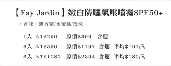 商品訊息簡述: 平均每入最低只要180元(含運)即可購得【Fay Jardin】嫩白防曬氣壓噴霧SPF50+:1入/3入/6入,香味:無香精/水蜜桃/玫瑰。