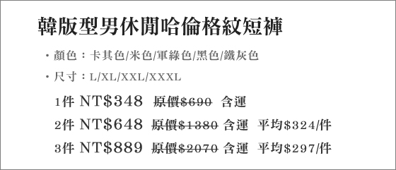 商品訊息簡述: 平均每件最低只要297元起(含運)即可帶回韓版型男休閒哈倫格紋短褲:1件/2件/3件,顏色可選:卡其色/米色/軍綠色/黑色/鐵灰色,尺寸可選:L/XL/XXL/XXXL。